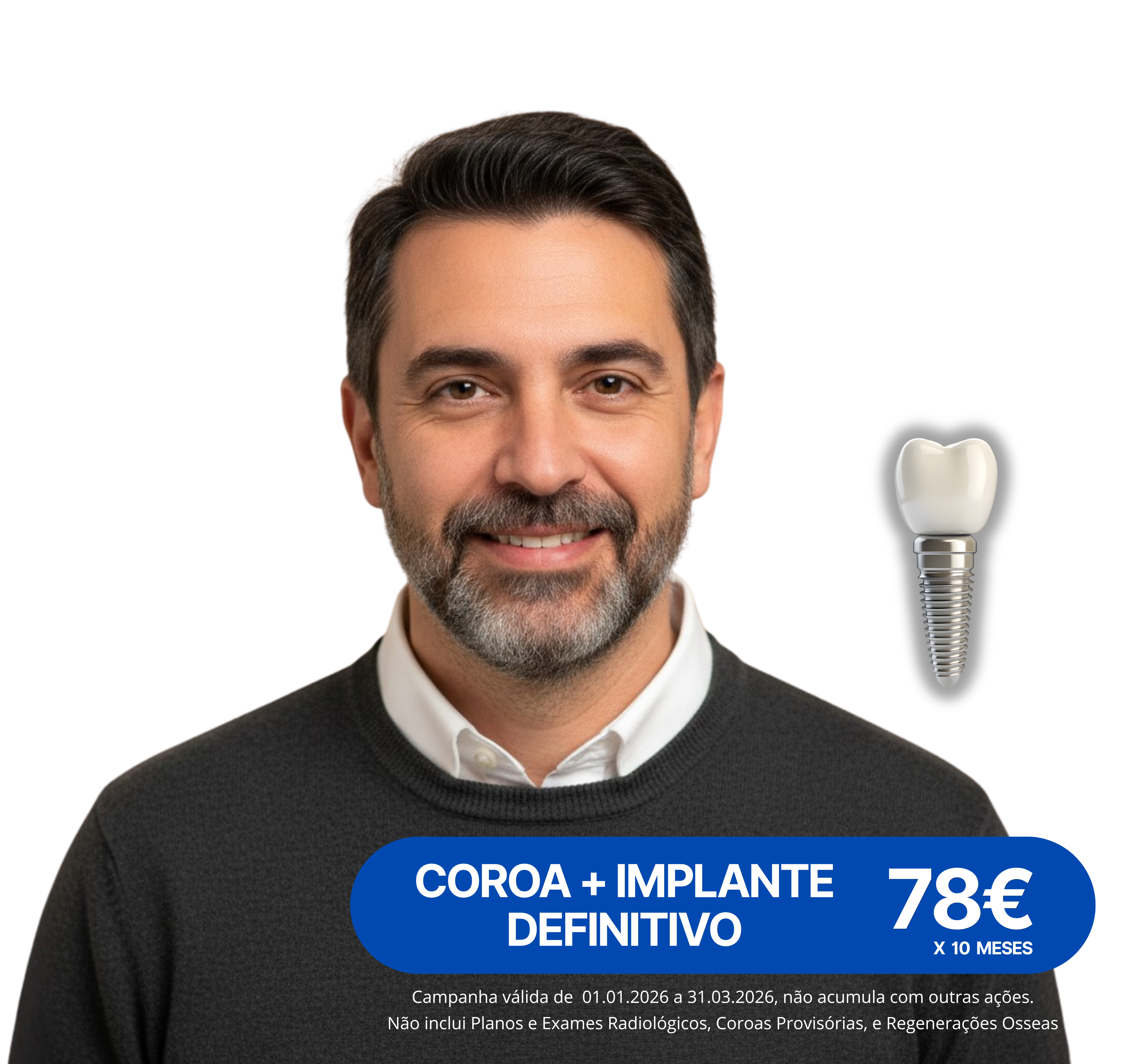 Campanha válida de 1 de Janeiro a 31 de Março, não acumula com outras ações. Não inclui Planos e Exames Radiológicos, Coroas Provisórias, e Regenerações Osseas